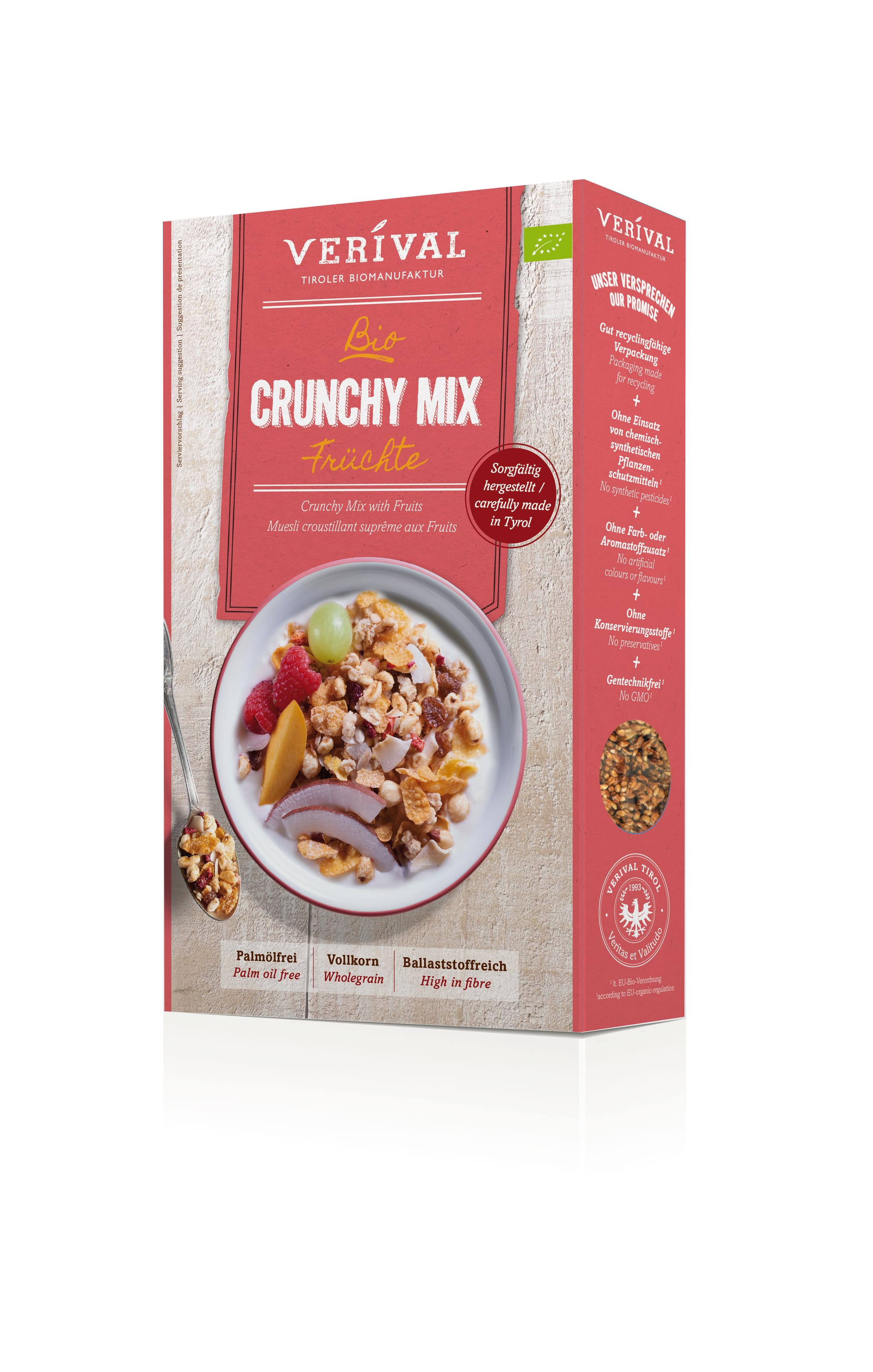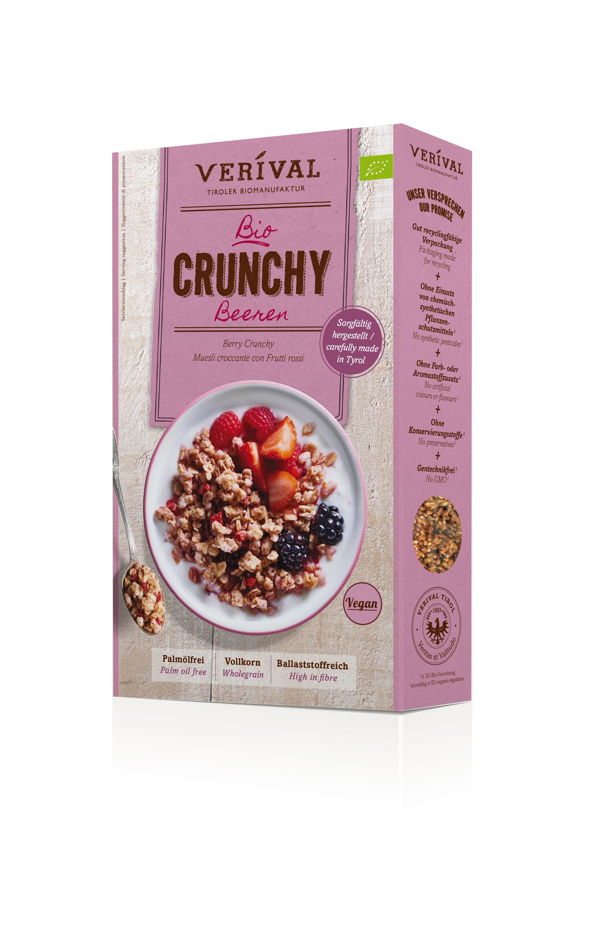 Manufactured by hand in Tirol Crunchy clusters of oats and rice crispies , flavoured with strawberries, raspberries and blackberries, then toasted and mixed to perfection in the Austrian Tyrol .We support sustainable use of natural resources by avoiding palm fat and exclusively using high-oleic sunflower oil instead .Very berry and 100% organic . Good morning!