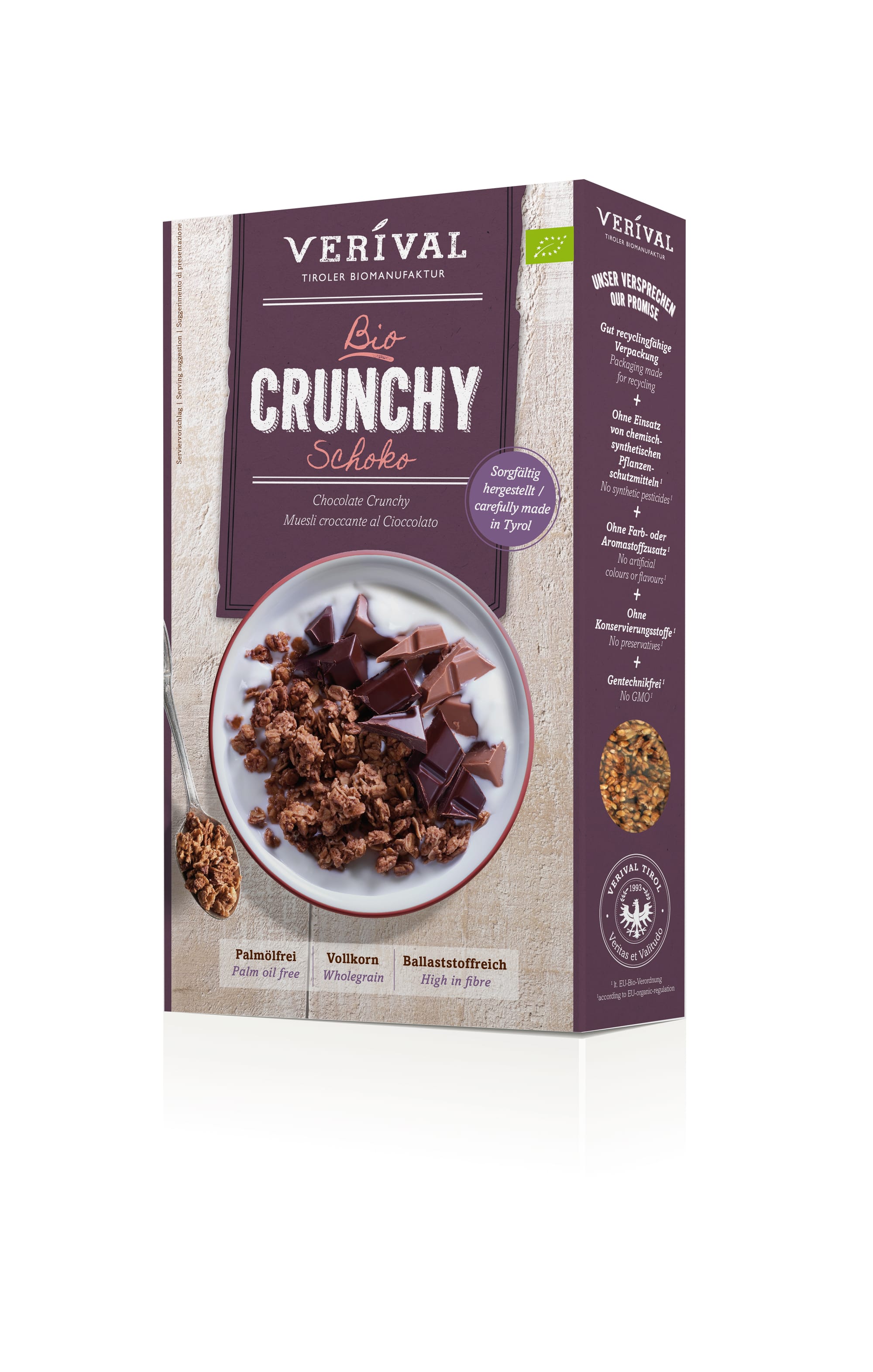 Crunchy clusters of oats and wheat, mixed with whole milk and dark chocolate chips , then toasted and mixed to perfection in the Austrian Tyrol. We support sustainable use of natural resources by avoiding palm fat and exclusively using high-oleic sunflower oil instead . Deliciously biscuit and 100%organic. Good morning!