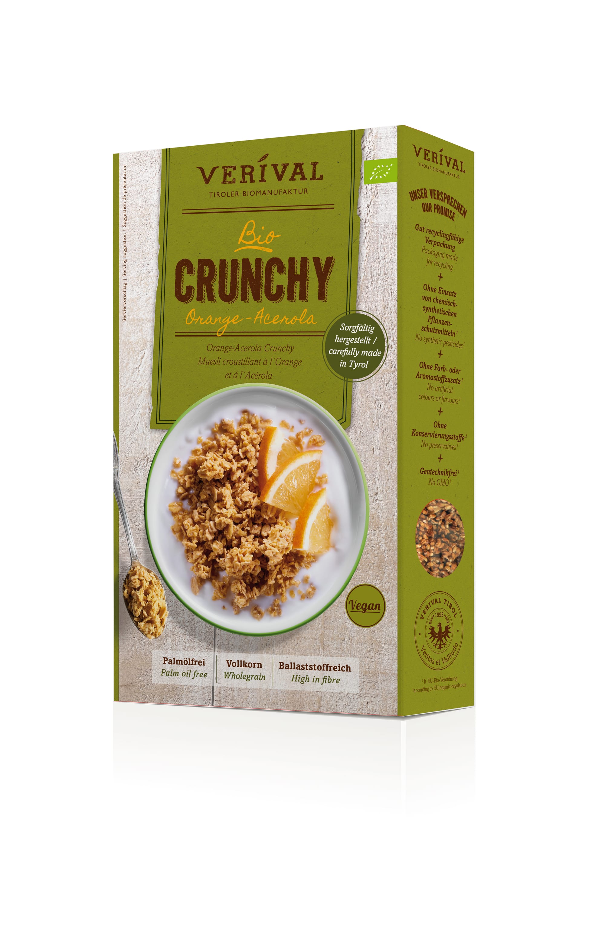 Crunchy clusters of oats and barley, flavoured with acerola cherry powder and orange oil , then toasted with sunflower oil and carefully made in the Austrian Tyrol. Deliciously biscuity and purely organic. Good morning.